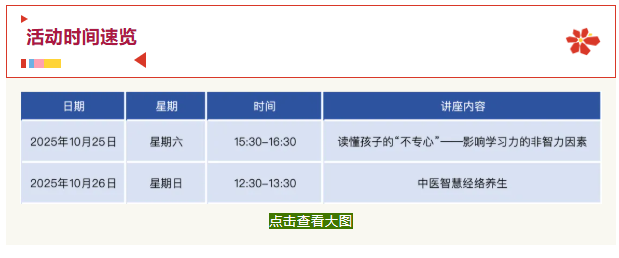 孩子注意力不集中?可能是情绪在“说话”;家人亚健康状态?中医有“妙招”。Do市百家大讲堂十月新增活动限时招募中!聚焦“健康养生”与“家庭教育”,用两场活动,陪你一起读懂孩子、守护家人,把专业的智慧,化为日常的温柔。