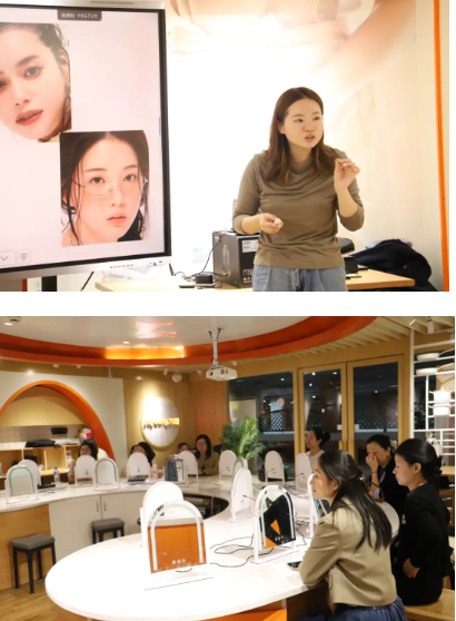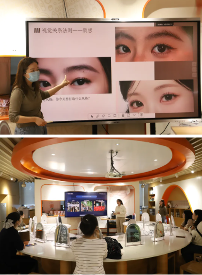 许宇敏老师以眉为引,开启面部美学的第一课。她从五官比例到面部轮廓,生动解析眉型与脸型的搭配奥秘。圆脸宜微挑,增强立体感;方脸适弯月,柔化轮廓线;长脸选平眉,优化视觉比。专业的"眉型诊断",让每位参与者找到了专属自己的美丽密码。