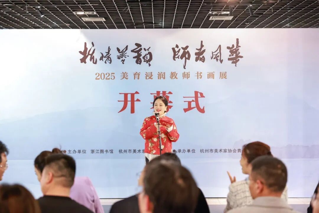 11月15日下午,由浙江图书馆、杭州市美术家协会联合主办,杭州市美术家协会青少年分会承办的“‘杭’情墨韵 师者风华——2025美育浸润教师书画展”,在浙江图书馆(曙光路馆)一楼展厅举行开幕式。杭州市文学艺术界联合会秘书长程育青,杭州市基础教育研究室美术教研员、中国美术家协会会员李方,杭州市美术家协会副主席兼青少年分会主席高甬春,以及分会副主席,分会创作辅导委员会副主任,秘书长等领导和嘉宾出席开幕式,与近百位参展教师、艺术爱好者共赴这场初冬的艺术之约。