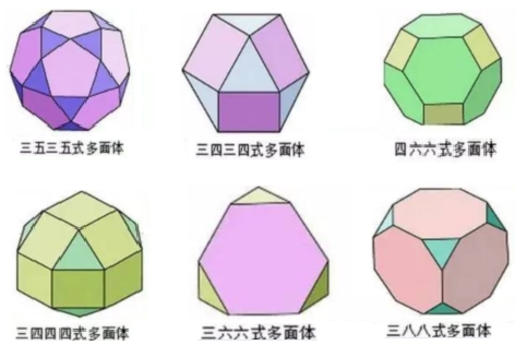 阿基米德体:由两种或两种以上的正多边形组成的立体图形,以下只例举其中六种——