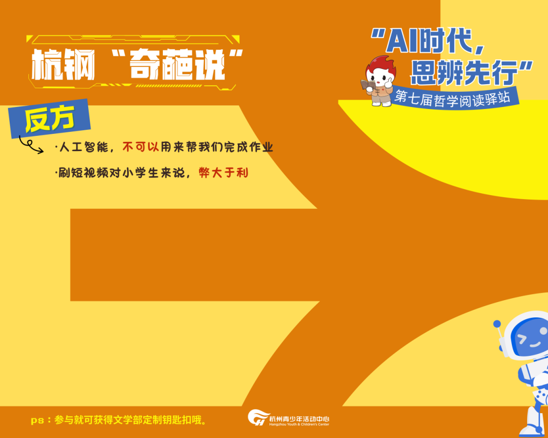 • 成为“杭钢小辩手”:加入我们的“奇葩说”,对“AI能帮我们写作业吗?”“刷短视频是利是弊?”这些酷炫话题,大胆写下你的独立见解!没有标准答案,你的思考就是最棒的答案。