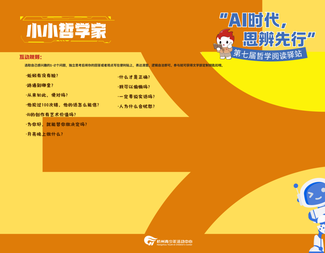 2025年12月14日(本周日),在杭州青少年活动中心半山分中心游乐园,我们为你准备了一场名为“AI时代,思辨先行”的哲学阅读嘉年华!这不仅仅是一场活动,更是一次点燃思考火花的奇妙冒险。