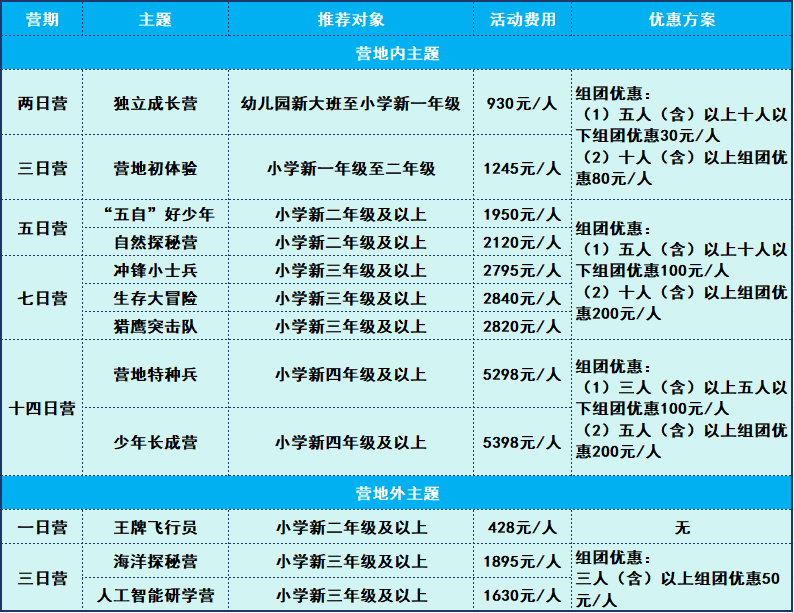 今年夏天,洞桥营地特别推出了“营地初体验”“冲锋小士兵”“生存大冒险”等9个营地内主题夏令营和“王牌飞行员”“海洋探秘营”“人工智能研学”等3个营地外研学夏令营。这一次,活动内容再创新、活动形式再优化、活动体验再升级、活动保障再强化,让我们一起来看一看吧!