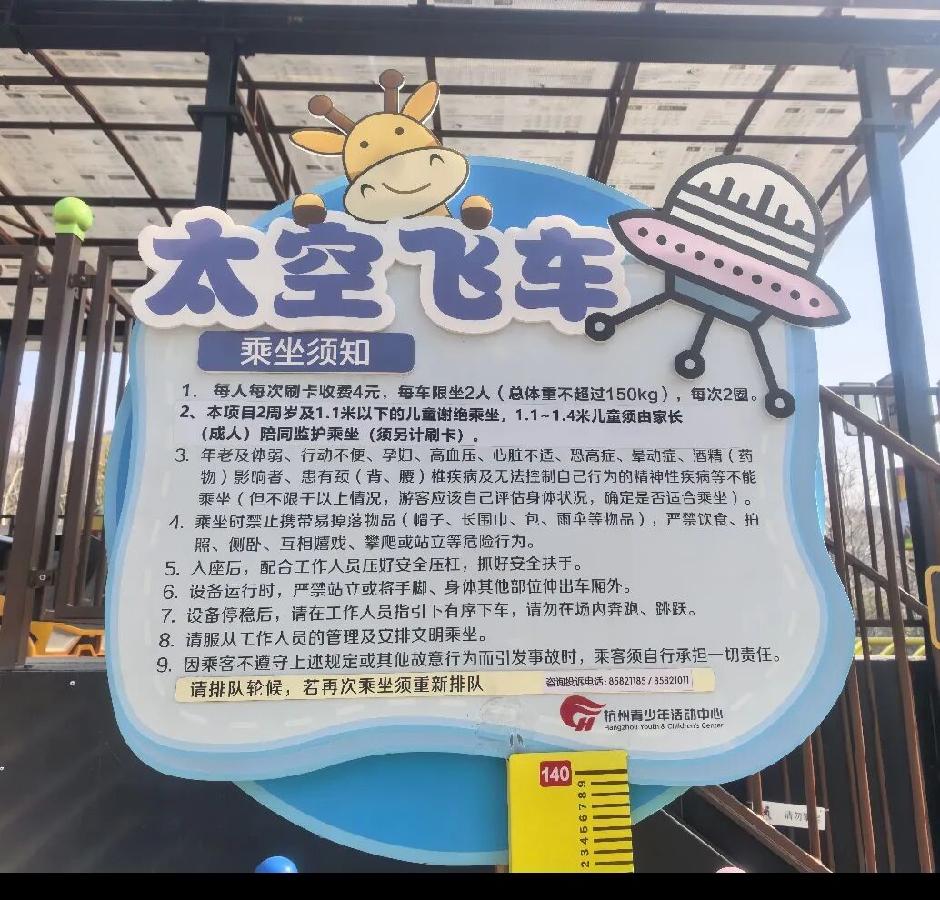 身高门槛:两周岁及1.1米以下的小朋友谢绝乘坐,1.1--1.4米的小朋友须家长陪同乘坐(安全第一哦~)。