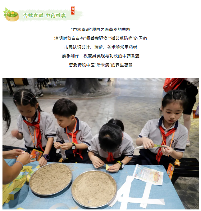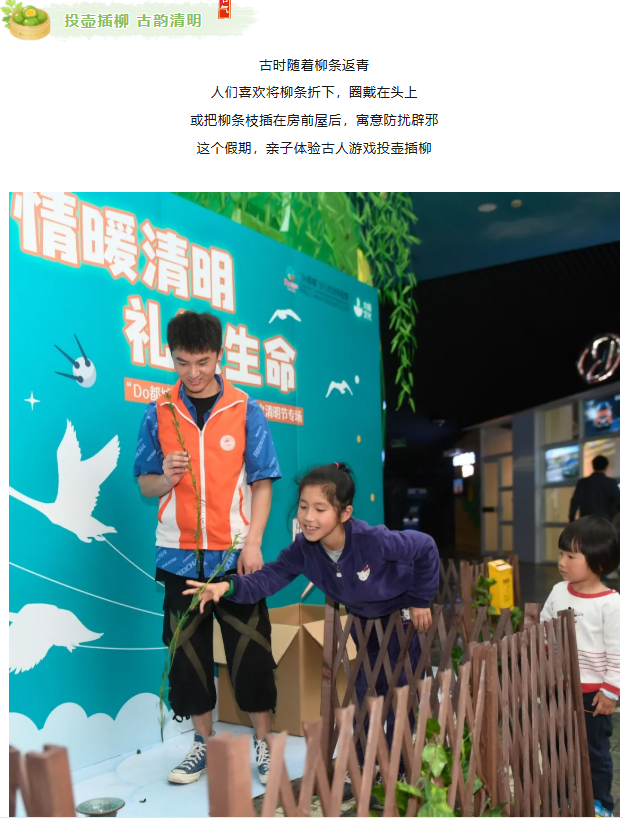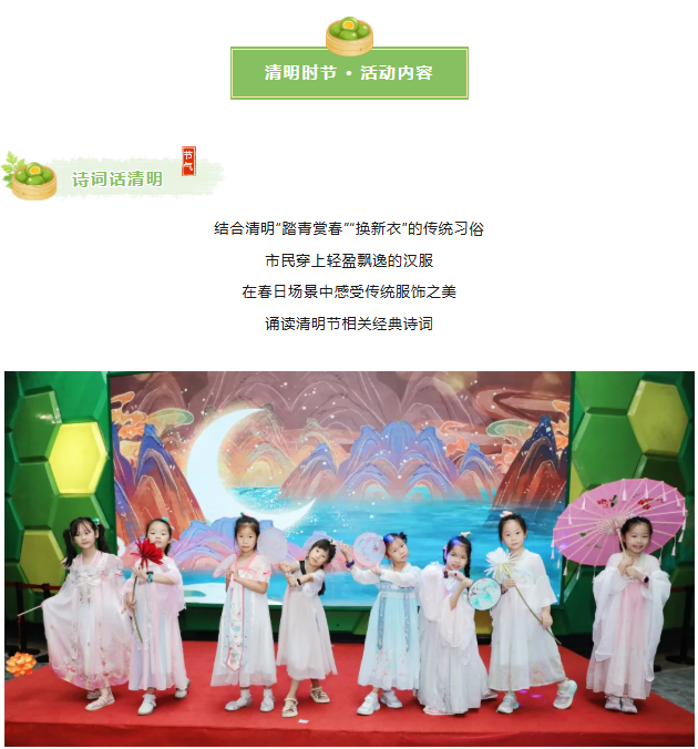 本次“杨柳青青”清明主题活动创设沉浸式传统文化体验,城市市民可以参与汉服诵诗、中药香囊制作、青团手作、投壶插柳等活动,在实践中了解清明习俗与文化内涵,感受传统魅力,实现文化传承与生命教育。