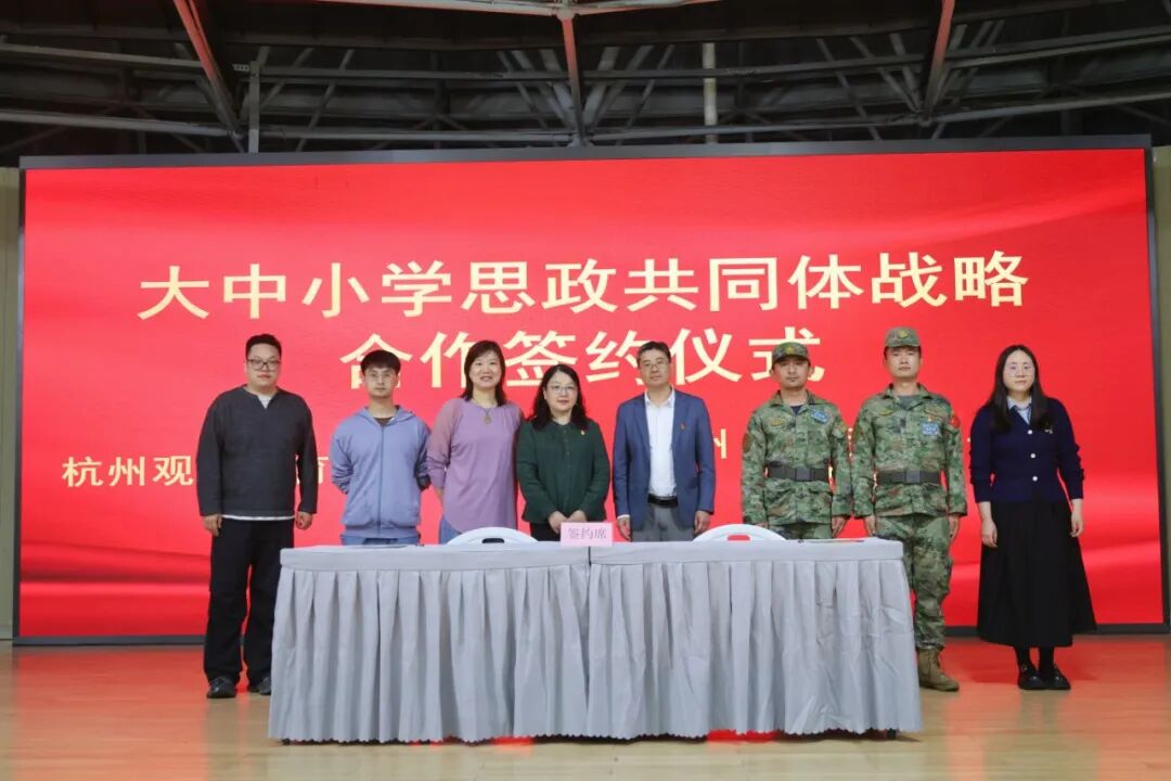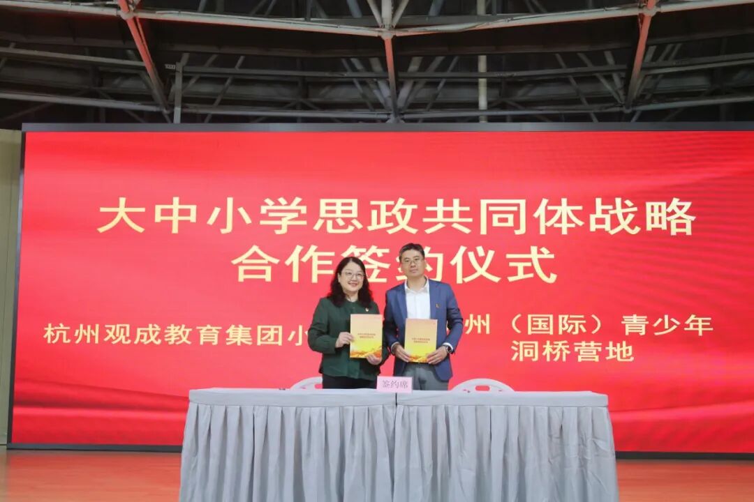 2026年4月10日,杭州(国际)青少年洞桥营地(以下简称“营地”)与杭州观成教育集团在营地举行党建联建、大中小学思政共同体战略合作签约仪式。双方单位领导、党员及教师代表出席活动。
