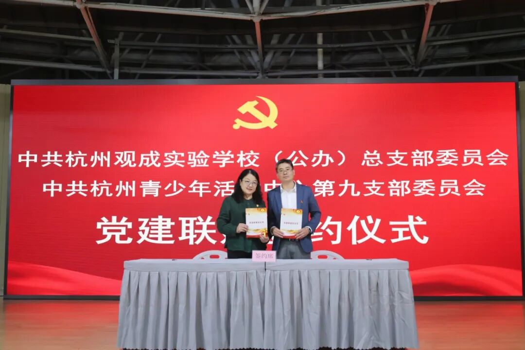 在签约仪式上,杭州观成实验学校党总支书记、杭州市观成武林小学书记干定雄与杭州青少年活动中心第九党支部书记、营地主任陈俊华代表双方签署《党建联建协议书》和《大中小学思政共同体战略合作协议书》。在本次合作中,中共杭州青少年活动中心第九支部委员会与中共杭州市观成武林小学支部委员会、中共杭州观成实验学校(公办)总支部委员会正式签订党建联建协议,营地与杭州观成实验学校(公办)、杭州市观成武林小学、杭州市观成武林中学共同签订大中小学思政共同体战略合作协议。