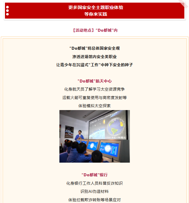 4月,作为“杭州市总体国家安全观青少年教育基地”的“Do都城”开展“童心连国心,安全向未来”主题教育活动,通过互动体验的方式,让孩子们学习国家安全知识,树立总体国家安全观,增强安全意识与技能,成为维护国家安全的小卫士。