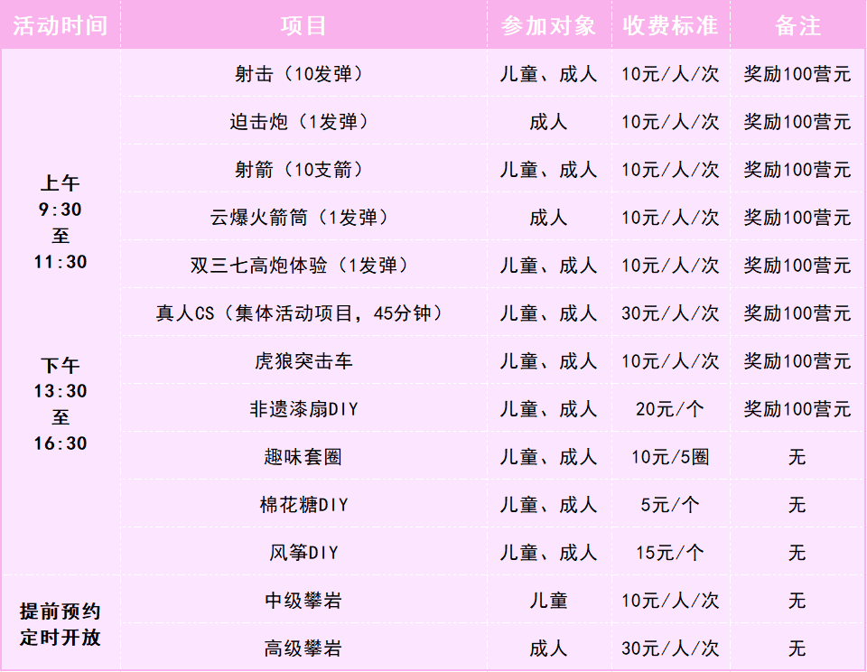 激光射击、云爆火箭筒、初级攀岩、射箭体验、棉花糖DIY、非遗漆扇、趣味套圈……爸爸妈妈带娃挑战新技能,大手小手一起创造甜蜜回忆!