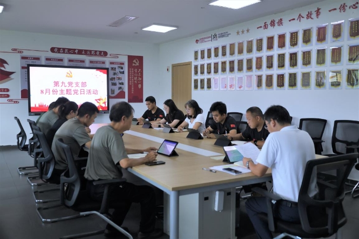 为进一步规范党徽党旗使用管理,提升党组织的凝聚力和战斗力,2025年8月14日下午,第九党支部在营地航母楼五楼会议室开展以“聚焦党徽党旗学习,践行党员先锋使命”为主题的党日活动。会议由党支部书记陈俊华同志主持,在岗党员参加。