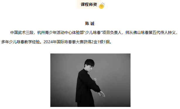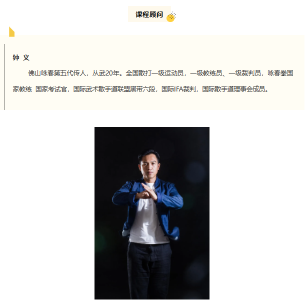 课程通过由浅入深、传统的训练方法学习咏春拳基础动作,掌握咏春拳的基本知识和技能和office运动,锻炼基础体能,增强体质,提高运动技能,培养运动兴趣,提高注意力和应变能力,让咏春融入生活,让健康融入工作。