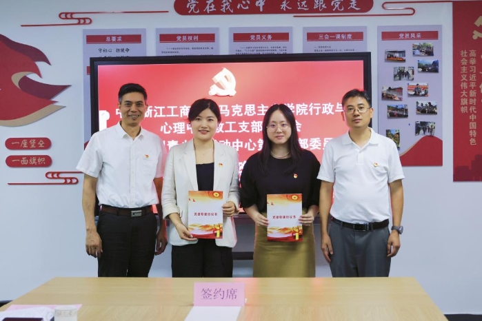 在签约仪式上,马院行政与心理中心教工党支部书记李佳、杭州青少年活动中心(以下简称“中心”)第九党支部组宣委员罗佳敏各作为双方代表,共同签署了《党建联建协议书》。