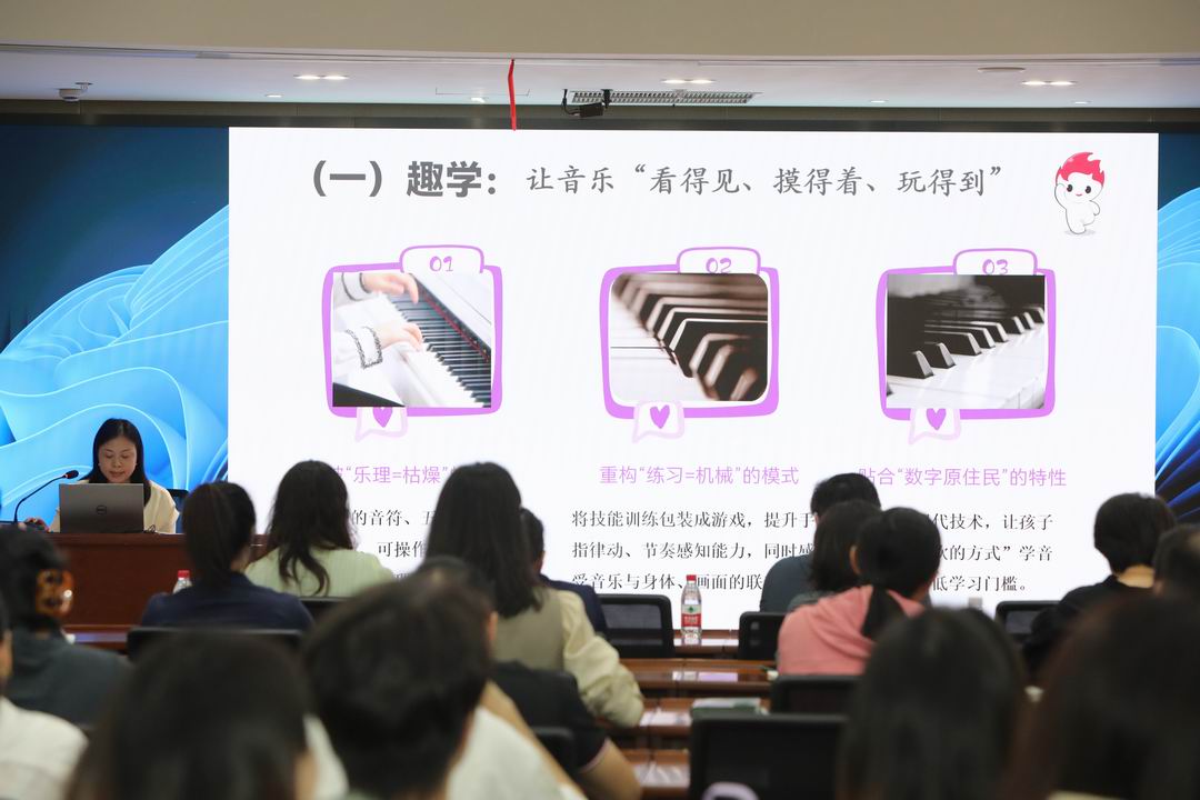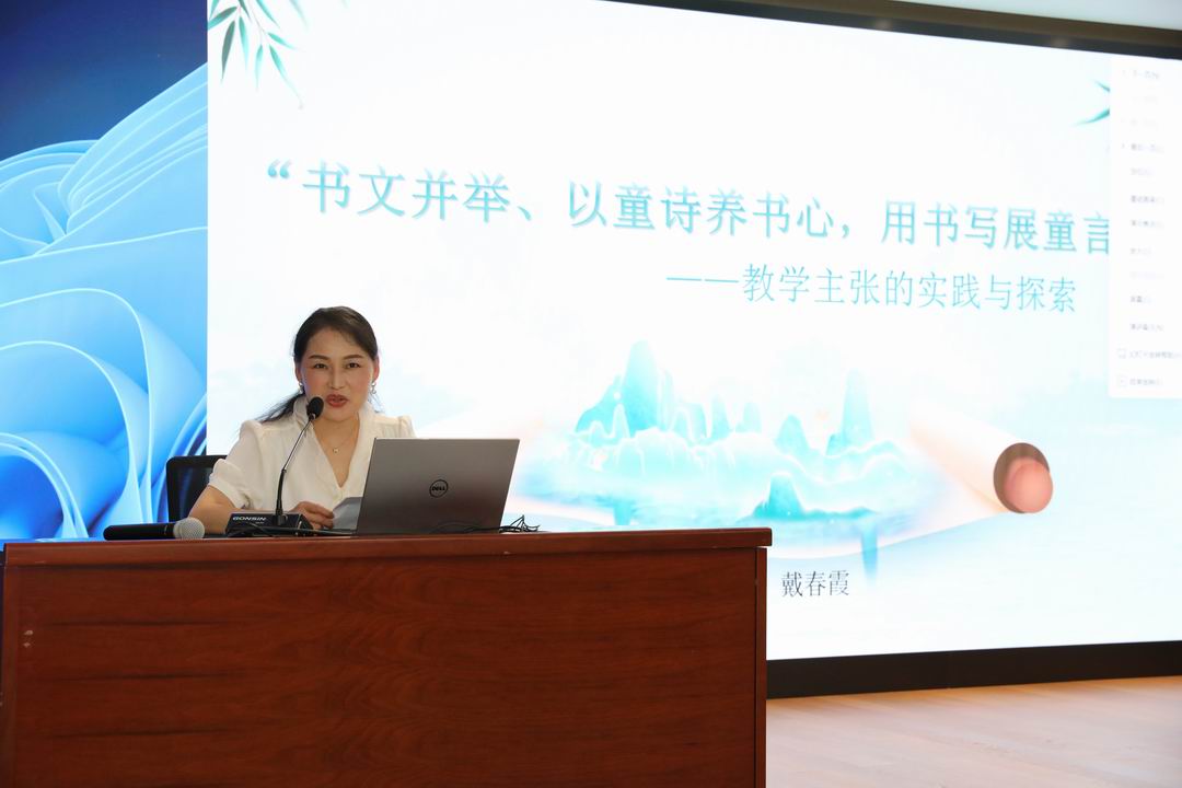 活动伊始,第一期首席教师培养对象戴春霞、王俊两位老师先后分享个人教学主张。戴春霞老师以“书文并举,以童诗养书心,用书写展童言”为核心,从主张的形成背景、理论支撑、核心框架、落地路径及教育实践价值等维度,系统阐述了个人教学主张。王俊老师则提出“打造键盘上的新三学”,主张构建“趣学、易学、乐学”的钢琴课堂,让每个孩子在黑白键上发现音乐的“彩色世界”,并结合主张的内容来源、理论基础、内涵与落地策略、课型分类特点及实践成效,展现了个人教学主张。两位老师的分享兼具实践深度与理论思考,为在场教师提供了鲜活的参考范例。
