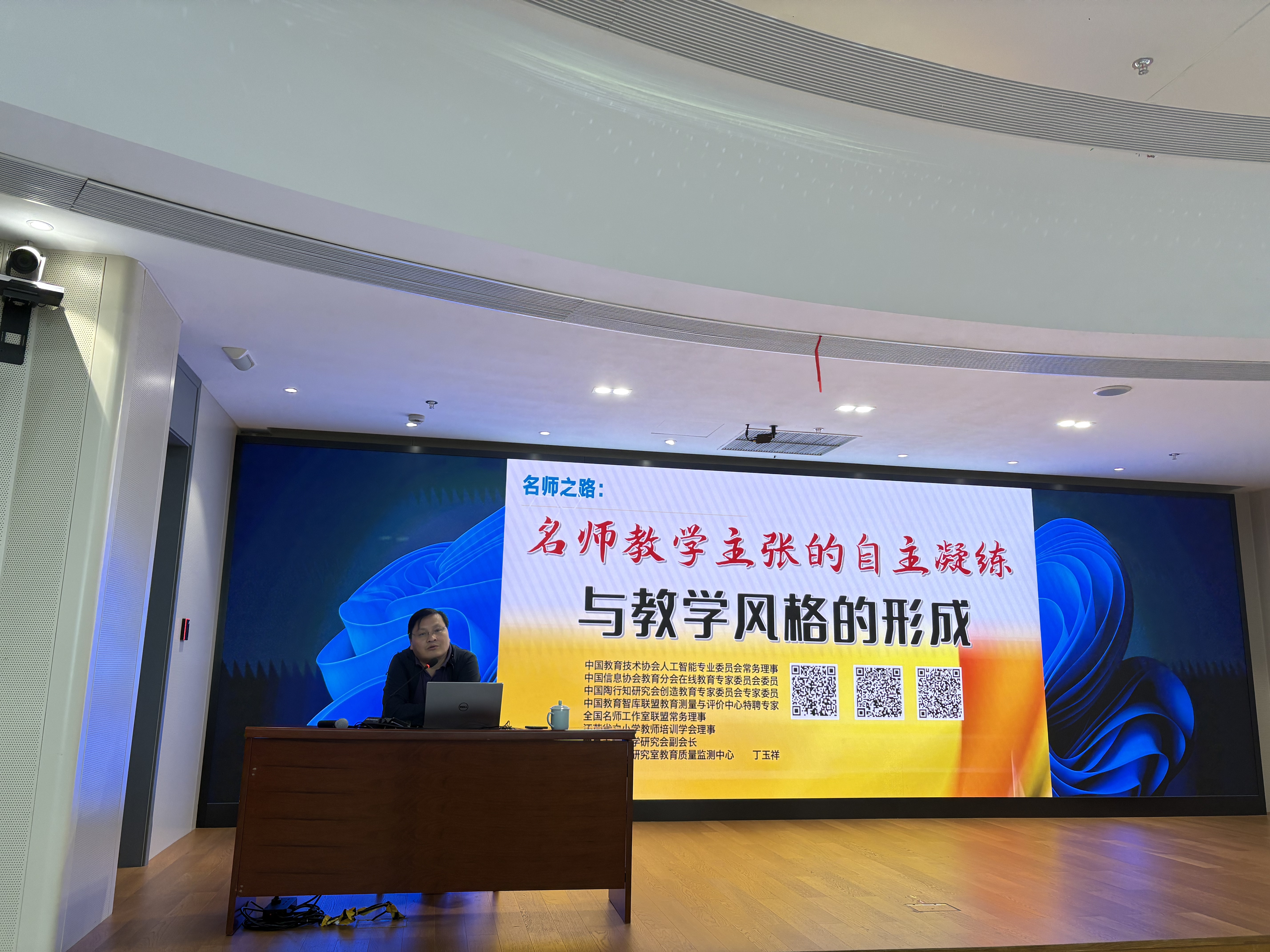 随后,南京市人民政府督学、南京市教学研究室教育质量监测中心评价教研员丁玉祥老师带来《教学主张的自主凝练与教学风格的形成》专题讲座。针对“教师如何凝练教学主张”这一核心问题,丁老师明确指出,教师需以“反思性实践者”的身份扎根课堂,以课例为载体、以学生为中心、从案例研究切入,用理性视角审视教学行为,逐步构建个人教学理论,最终生成专属教学主张。他进一步提出三大凝练策略:一是规避对自身教学经验与方法总结的片面性、极端性;二是推动理论阅读与实践思考深度融合,明晰个人教育教学的“中心思想”与“未来方向”;三是坚守一以贯之的教育教学思想主线与学科“灵魂”。在具体方法上,他建议教师通过“定期总结,聚焦教学智慧关键词”“反复打磨,固化教学主张核心”“依托课题,深化提炼并提升主张层次”三步,让教学主张从“实践萌芽”成长为 “理论成果”。