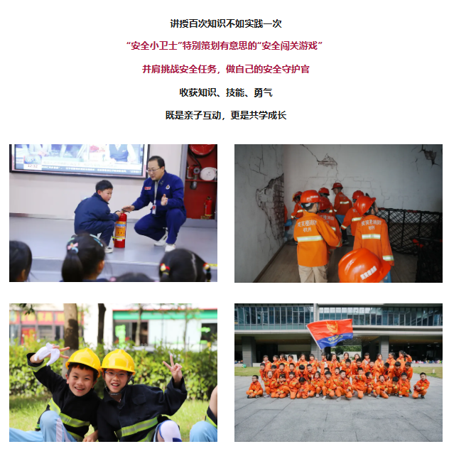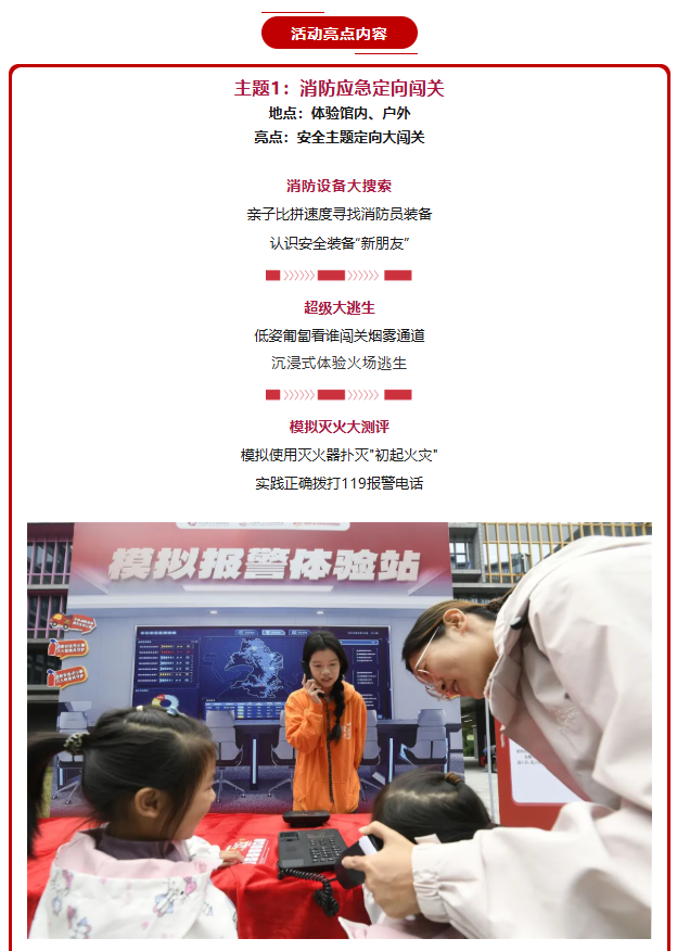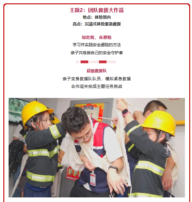 亲子开启安全大挑战,通过消防实操、应急救援协作任务等实践安全技能,提升应急反应与协作力,强化亲子默契,树立安全意识。