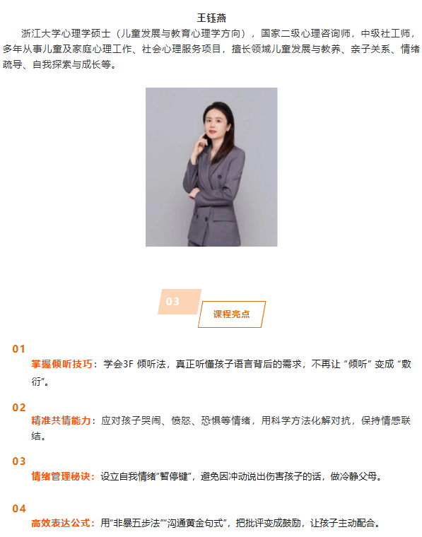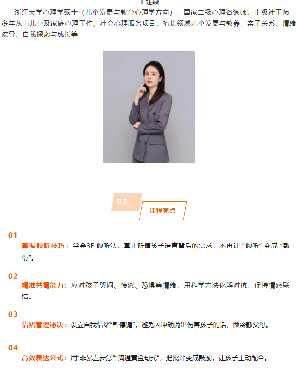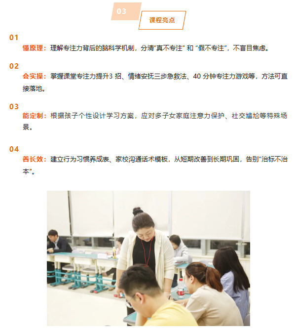 儿童专注力养成课程基于脑科学原理,从大脑的运转机制来了解专注力的本质,帮助父母破解养育困扰。通过实操演练,传授培养专注力、行为习惯等行之有效的养育方法,引导家长尊重和支持儿童大脑的优势区域发展,培养儿童调节情绪能力,建立良好的亲子关系。